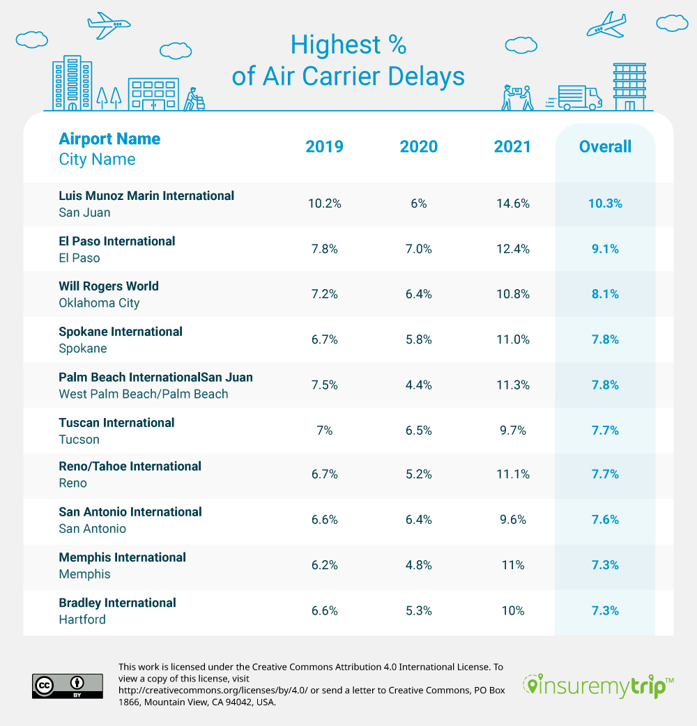 Air carrier delays present a challenge for all airports, as this may cause a hold-up when preparing for boarding. Luis Munoz Marin International in Puerto Rico and El Paso International in Texas led this category, with 10.27% and 9.05% respectively, potentially signifying issues regarding staff.