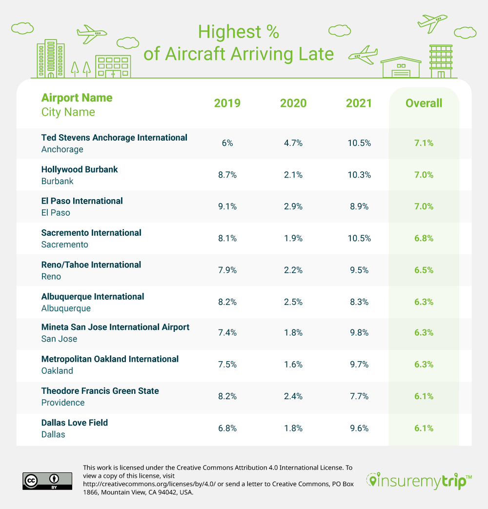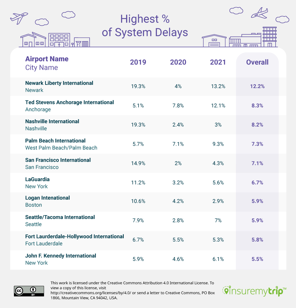 Both New York airports; John F. Kennedy International, with 5.53%, and LaGuardia, with 6.65%, appear in this list, possibly due to the heavy amounts of traffic the city receives. Nevertheless, an area for improvement.